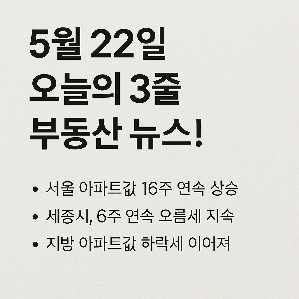 2025년 5월 22일 오늘 부동산 뉴스 총정리! 서울·세종 오르고, 지방은 하락?2025년 5월 22일 오늘의 부동산 뉴스 핵심 요약. 서울·세종 상승세, 지방 하락, 공급 부족과 금리 변수까지 지역별 시장 흐름 완전 분석! 안녕하세요 :) 오늘은 2025년 5월 22일 기준으로 정리한, 따끈따끈한 부동산 뉴스를 한눈에 살펴보려 합니다. 요즘 부동산 시장, 지역마다 분위기가 꽤 다르다는 얘기 많이 들으셨을 텐데요, 서울과 세종은 다시 오름세, 반면 지방은 여전히 하락세를 보이고 있다고 해요. 그럼, 2025년 5월 22일 오늘의 부동산 동향은 어떤 흐름을 보였을까요? 핵심 내용부터 빠르게 정리해드릴게요! ✅ 오늘의 부동산 핵심 요약 🔸 서울 아파트값, 16주 연속 상승 – 강남 재건축 중심 🔸 세..