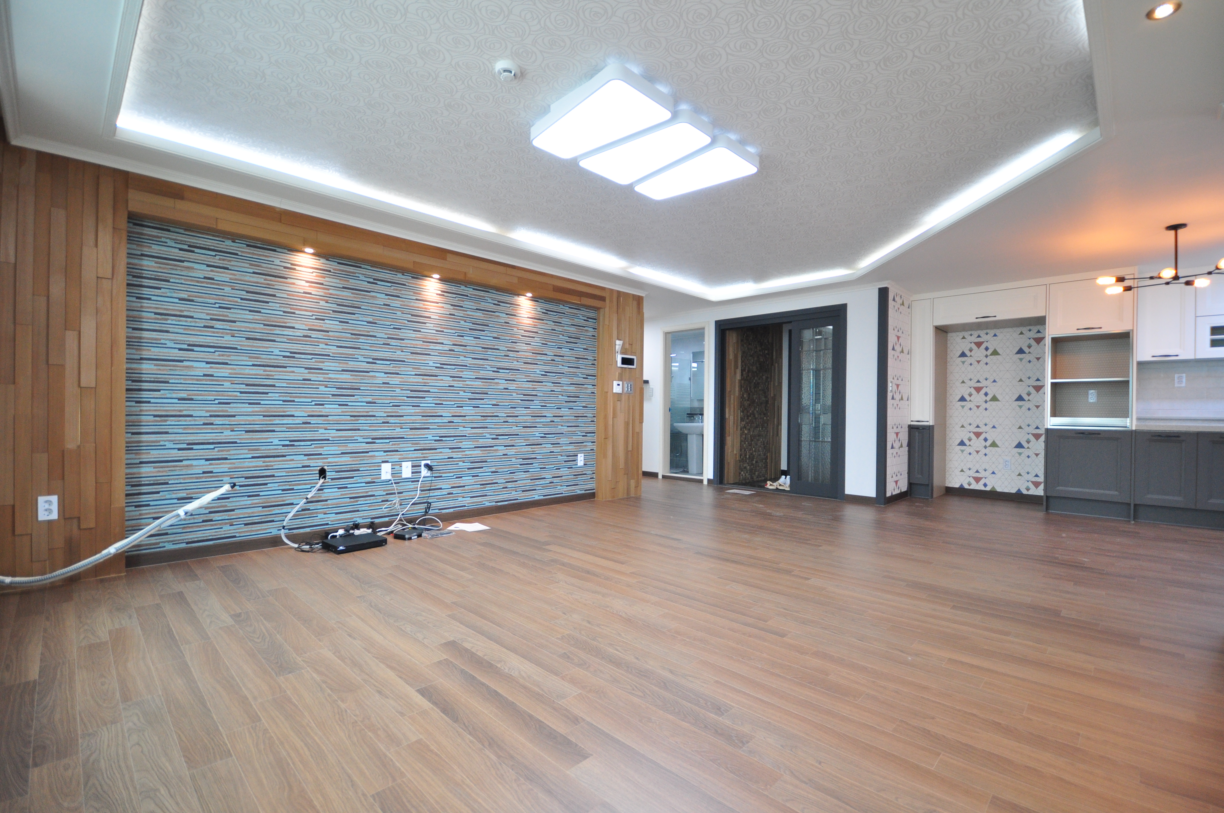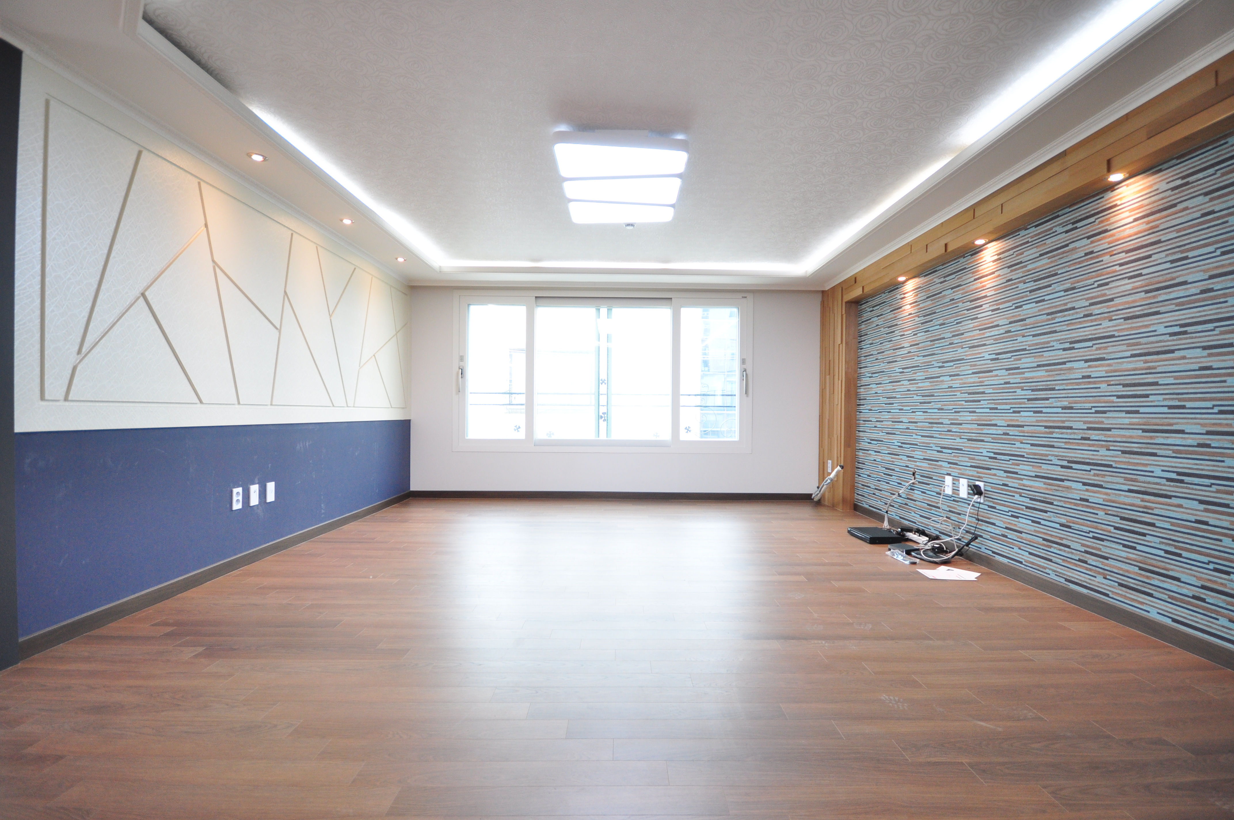 거실은 모던한 블루톤 포인트 벽과 원목 마감이 어우러져 고급스러운 분위기를 연출합니다.