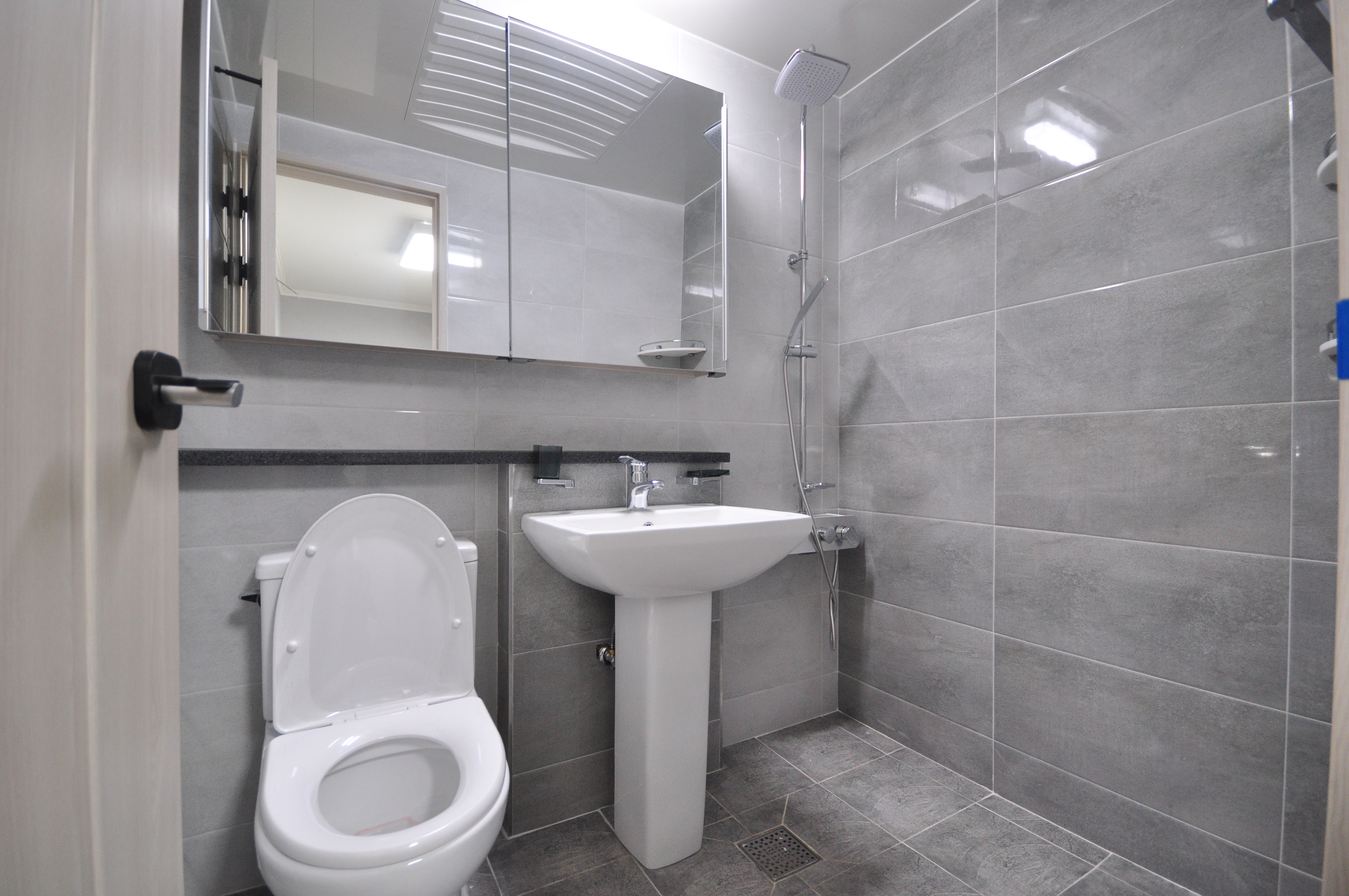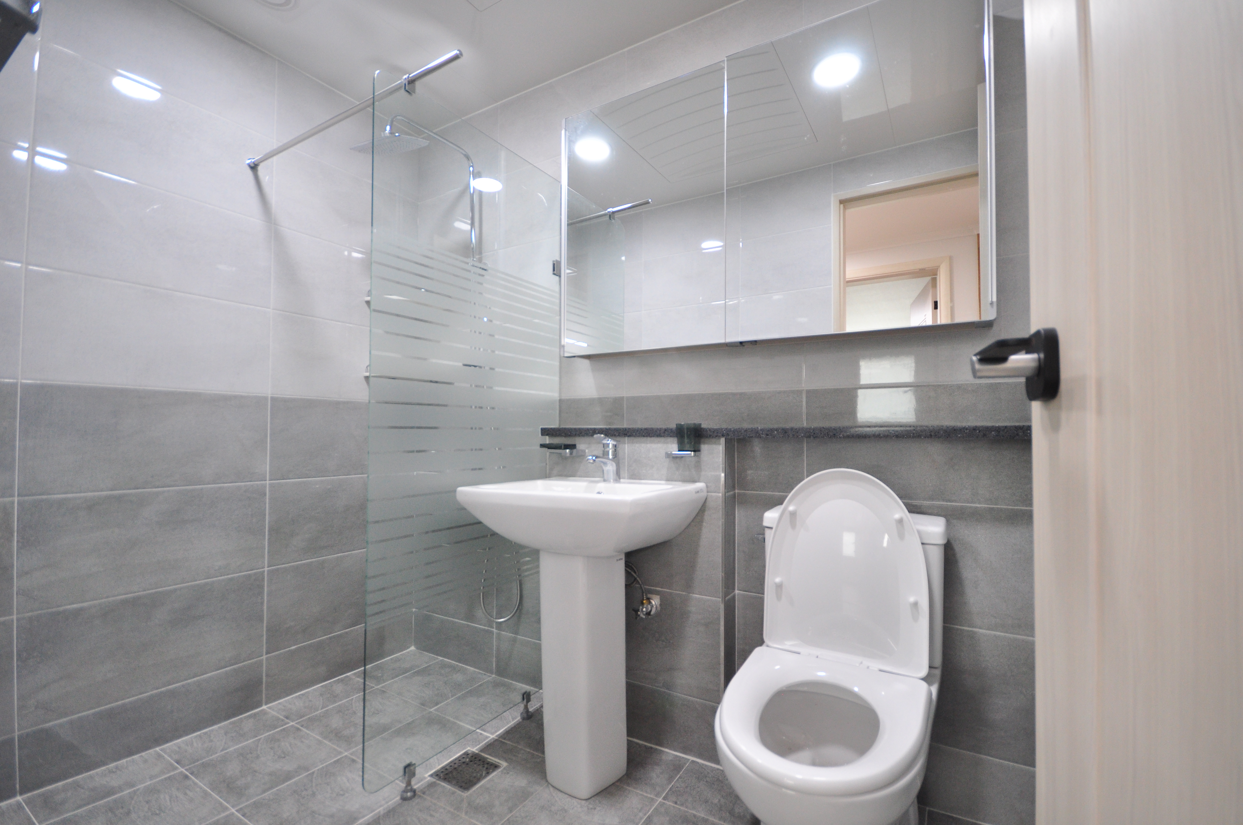 현대적인 타일과 환기창이 설치된 욕실은 쾌적하며, 세면대·수납장이 있어 깔끔한 관리가 가능합니다.