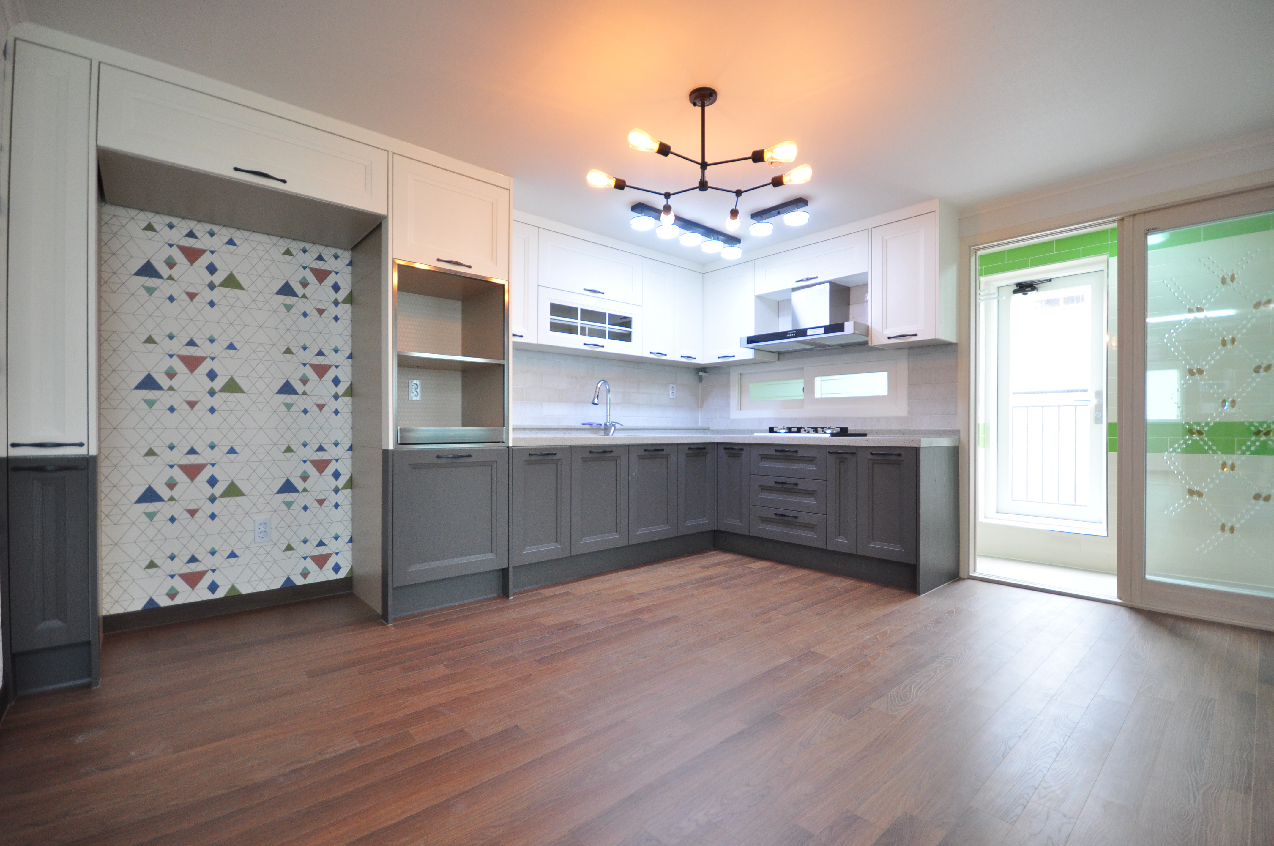 화이트톤 상부장과 그레이톤 하부장이 조화를 이루는 ㄱ자형 주방.