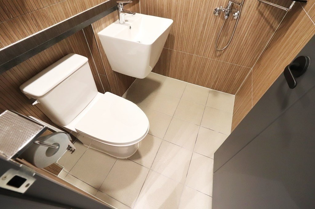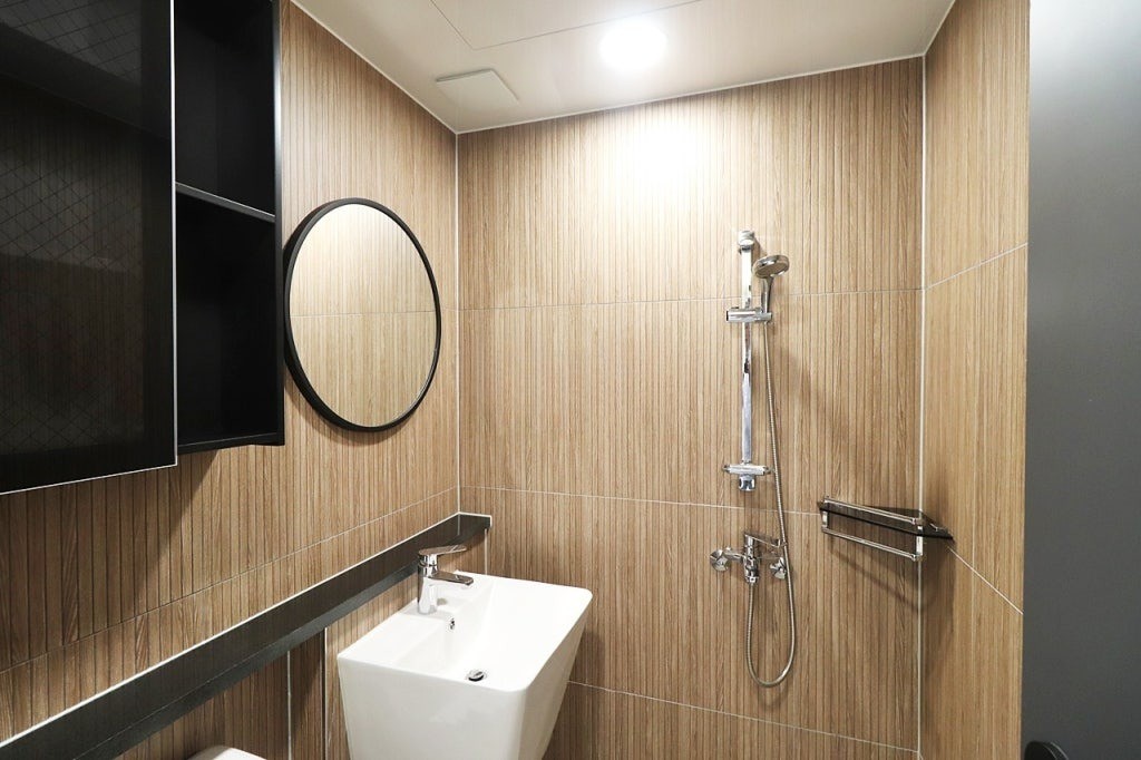 브라운 톤 타일로 마감된 욕실은 세면대, 변기, 샤워 공간이 분리되어 있어 쾌적하게 사용할 수 있습니다.