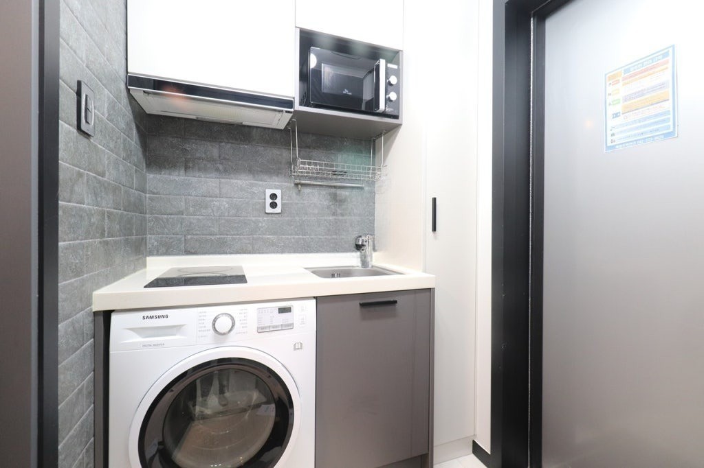 주방에는 인덕션, 세탁기, 냉장고, 전자레인지가 모두 구비되어 있습니다.