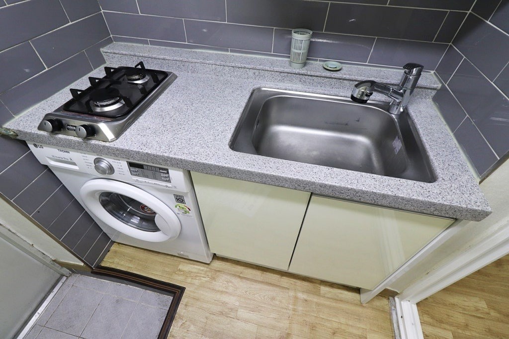 2구 가스렌지, 넉넉한 싱크볼, 상부장/하부장, 세탁기까지 풀옵션으로 구성되어 있습니다.