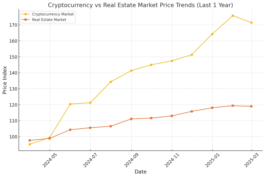 [그래프] 최근 1년간의 코인 시장과 부동산 시장 가격 변동 그래프